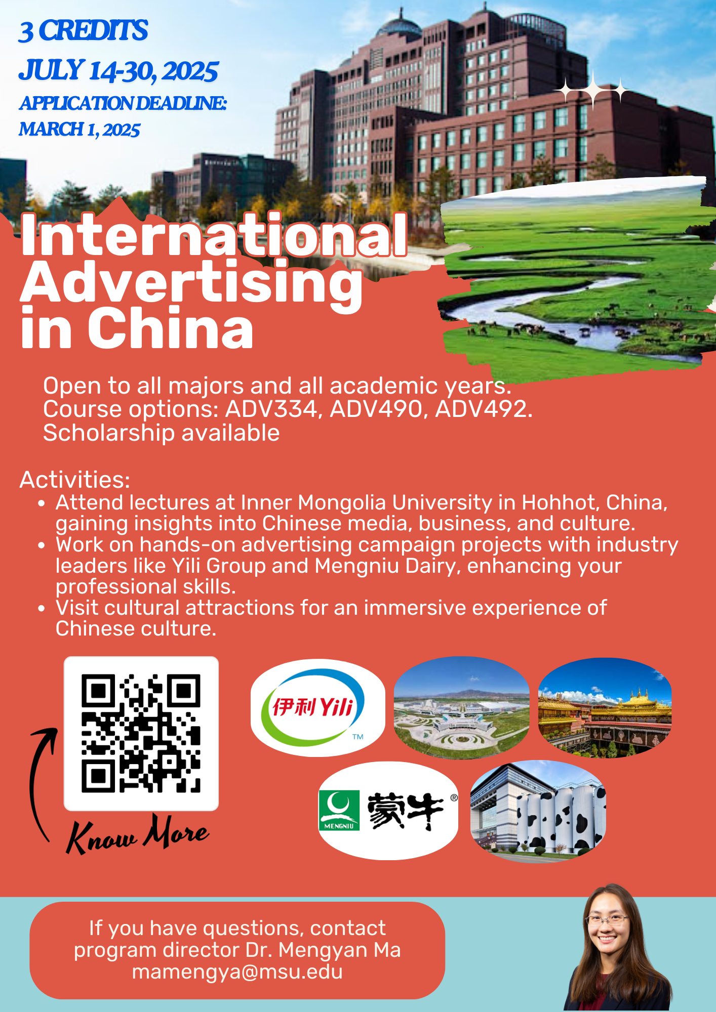 I direct a 2-week Education Abroad Program titled "International Advertising in China," offering students the opportunity to blend academic learning with practical experience in one of the world’s most dynamic markets. I presented my program at MSU Global Learning Expo Event in October 2024 and hosted an information session that accommodated both in-person and Zoom participants in December 2024 and February 2025.